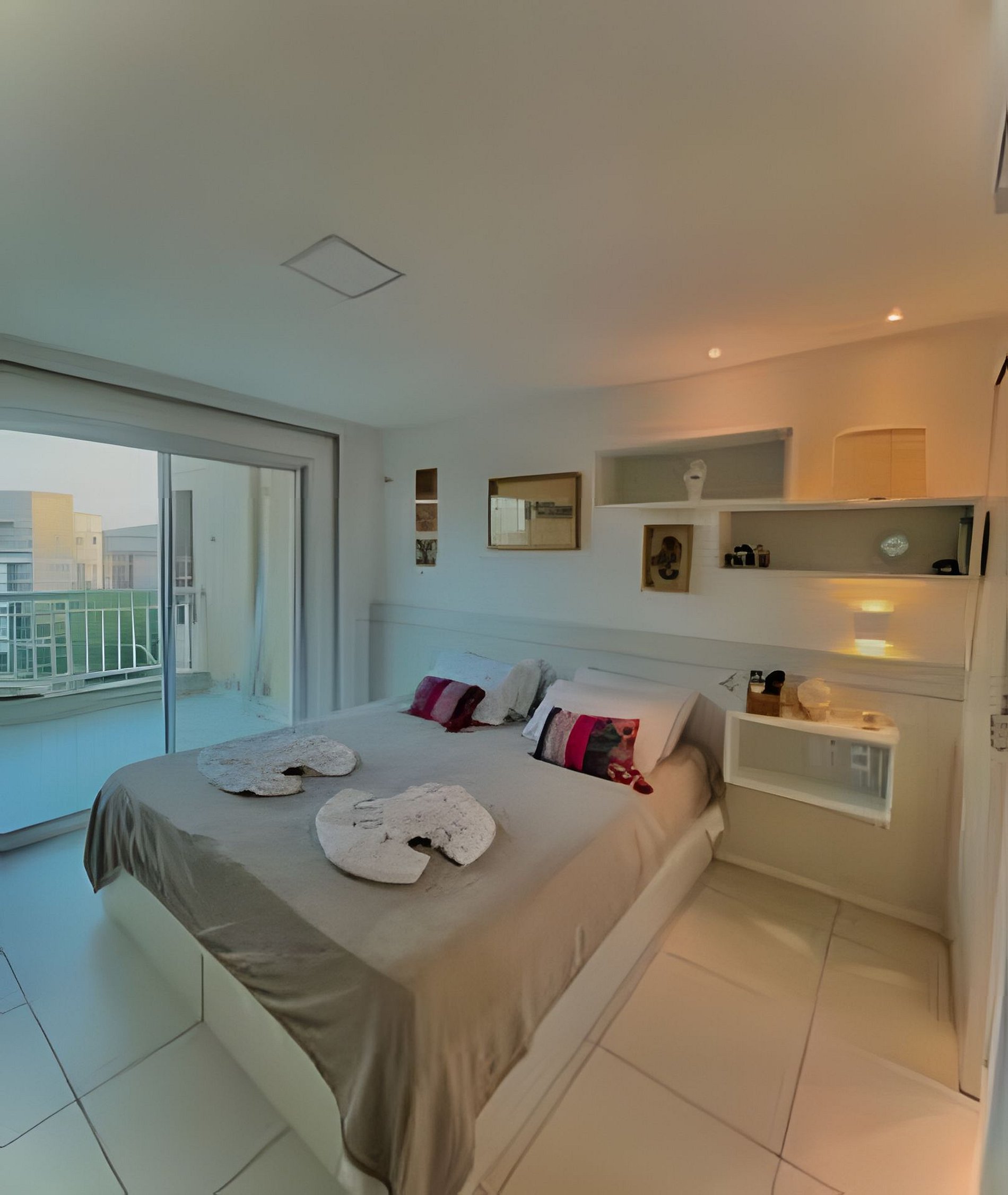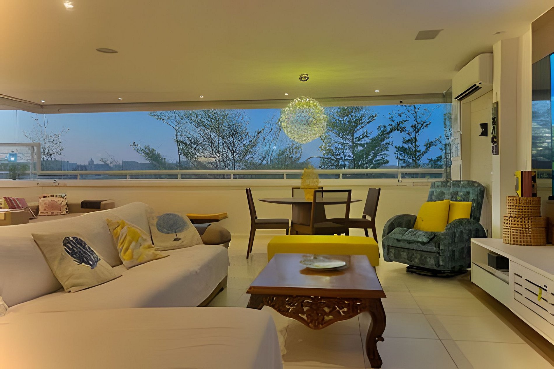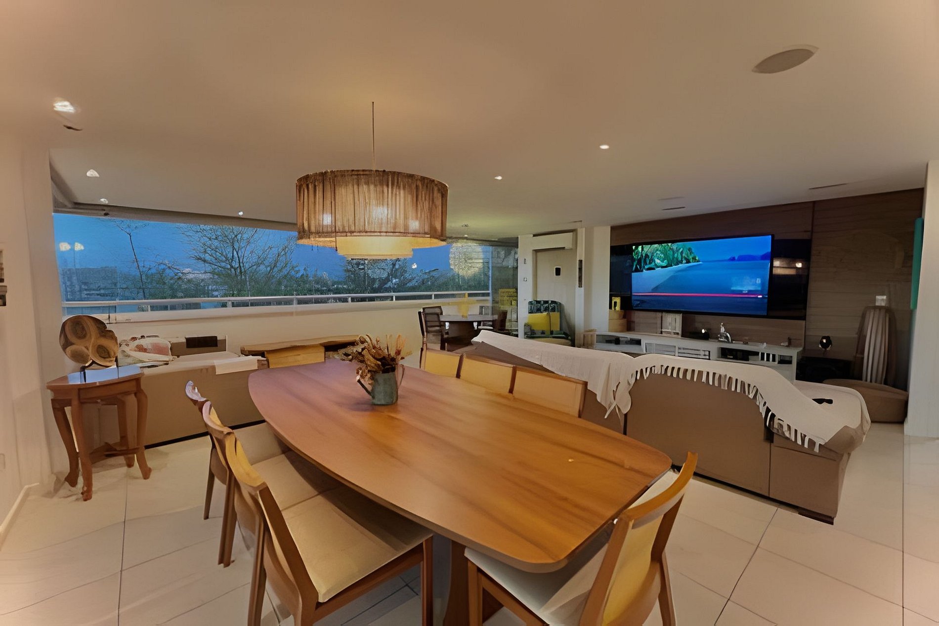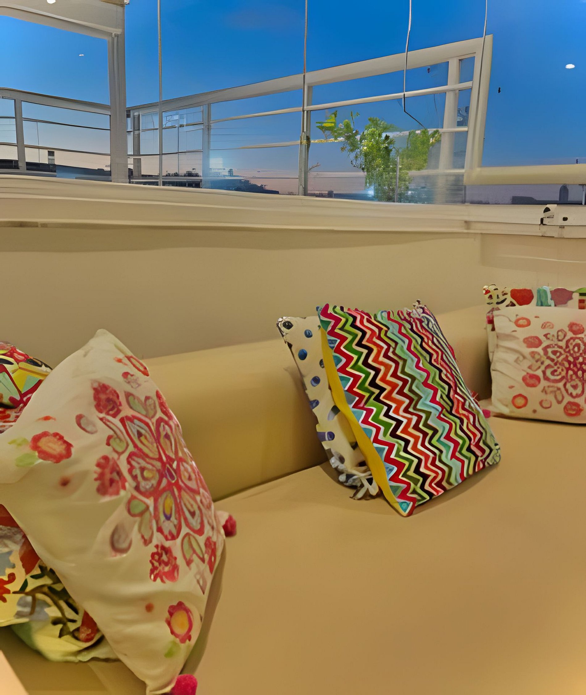 In the living room, integrated with the balcony, a sofa bed accommodates two more guests — ideal for those who enjoy sleeping to the sound of the sea breeze.