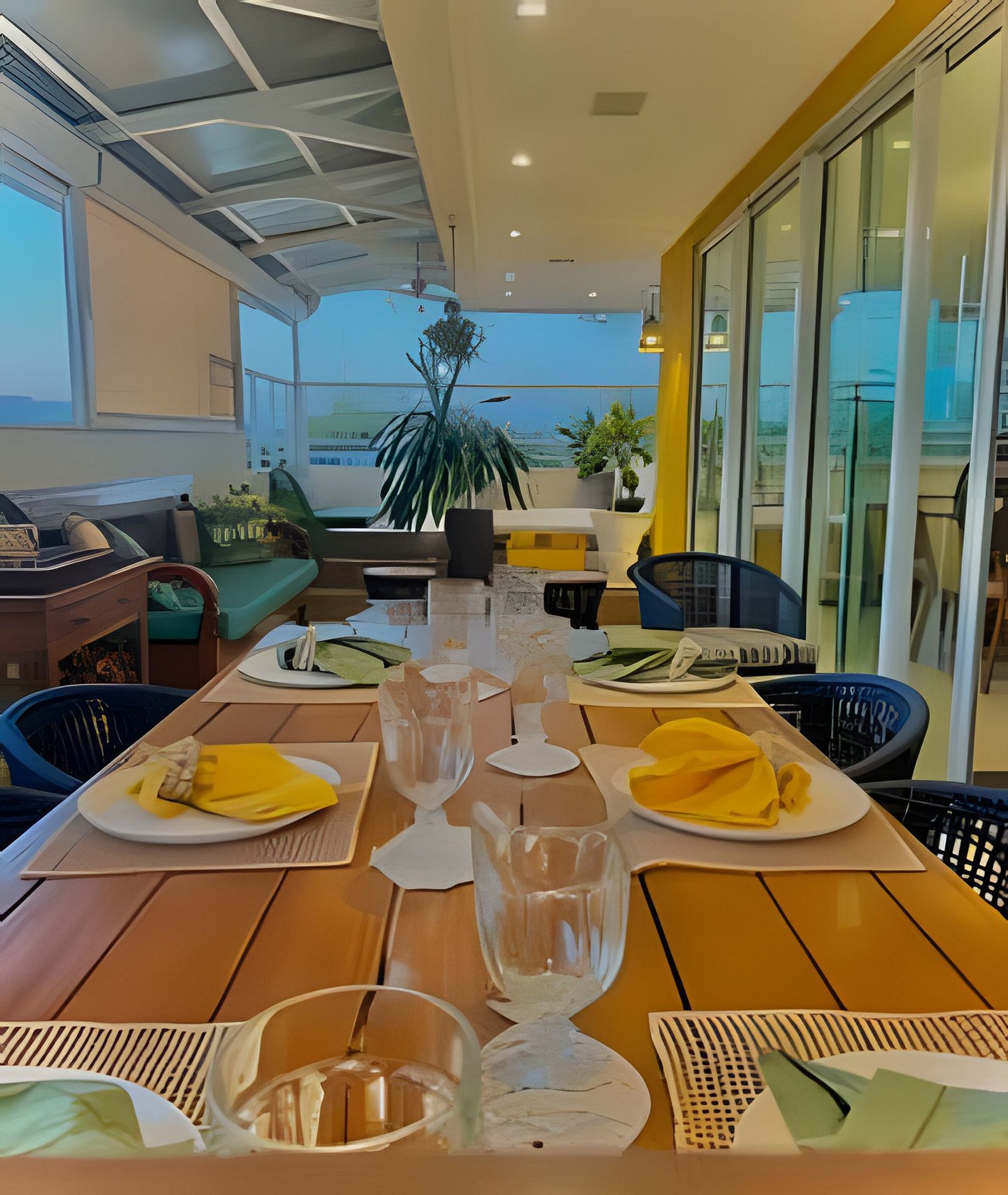 The gourmet balcony is a highlight on its own: a jacuzzi with a view, private barbecue, and a large table for outdoor dining — the perfect setting to unwind after a day at the beach.