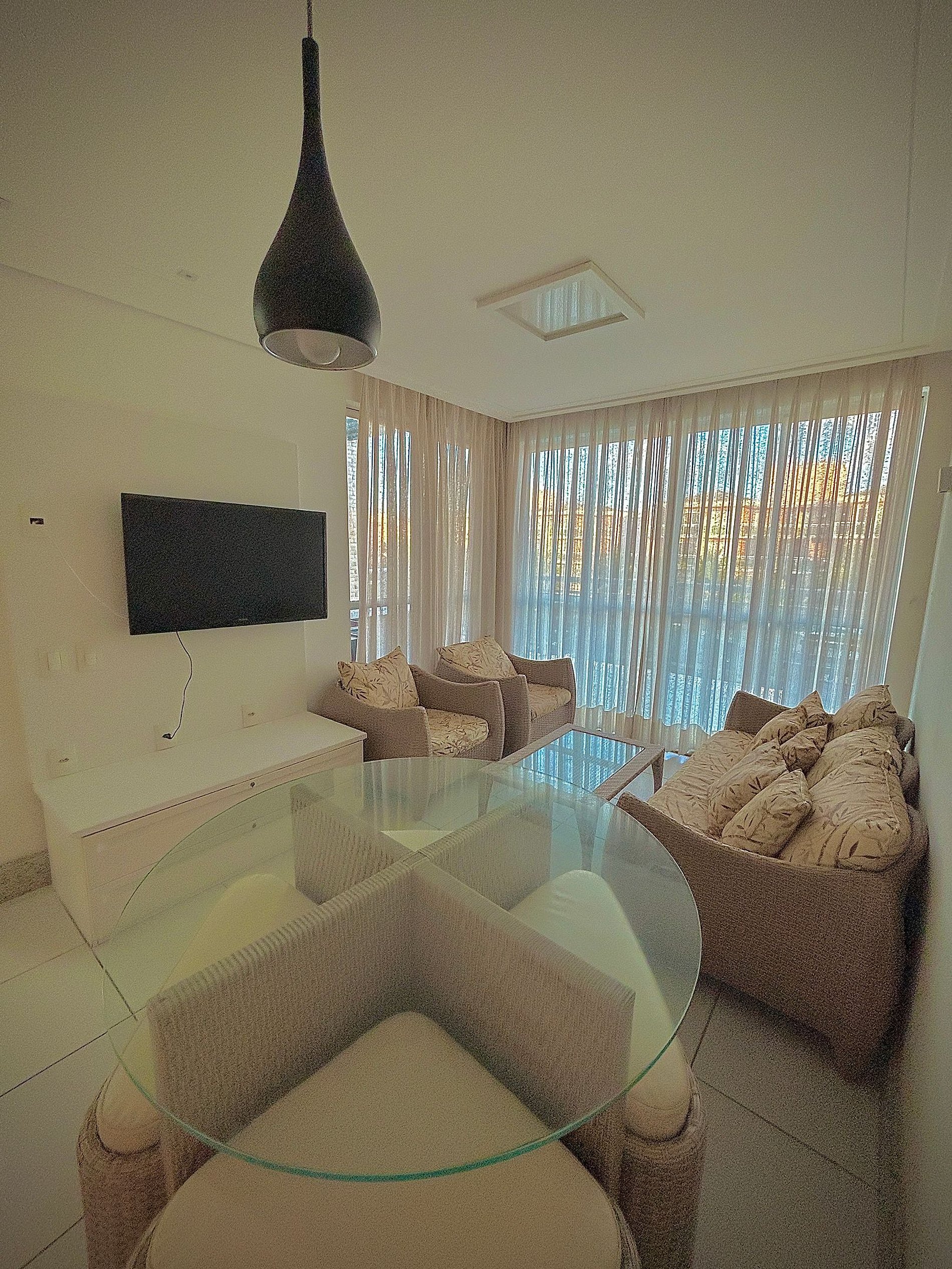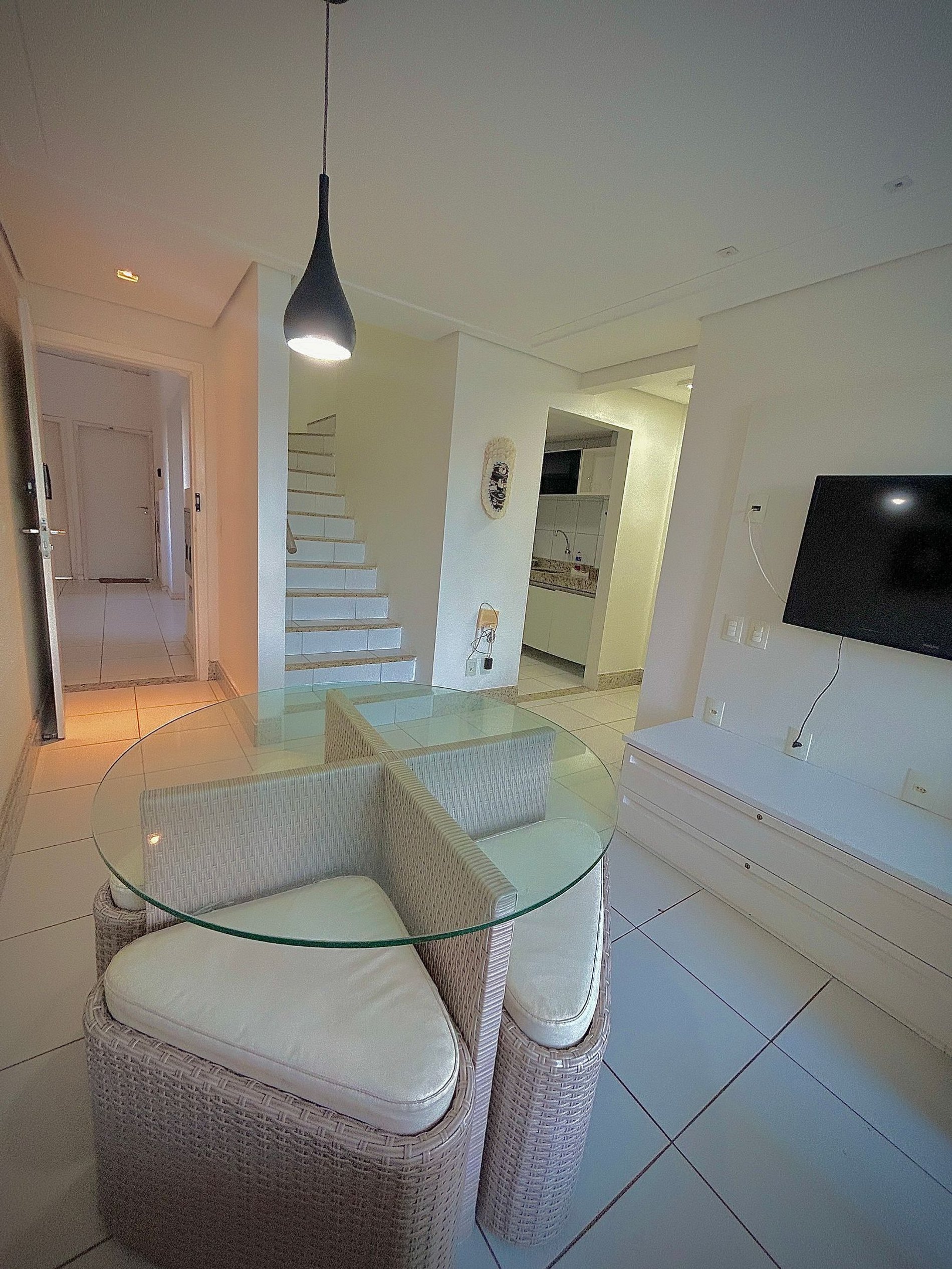 • Sala de estar com sofá, TV e mesa de jantar.