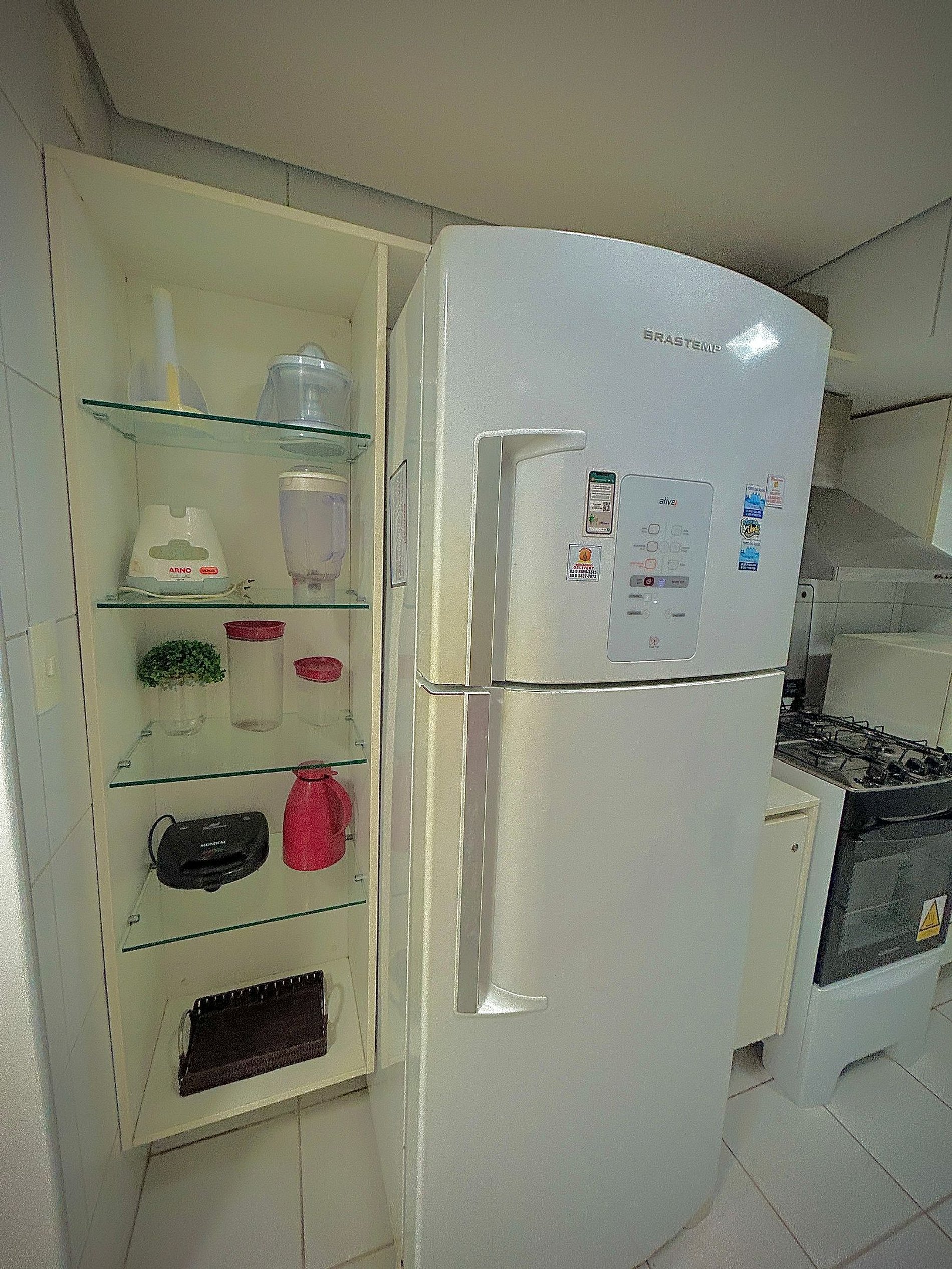 • Cozinha completa com geladeira, fogão, forno, micro-ondas, airfryer, louças, panelas e utensílios.